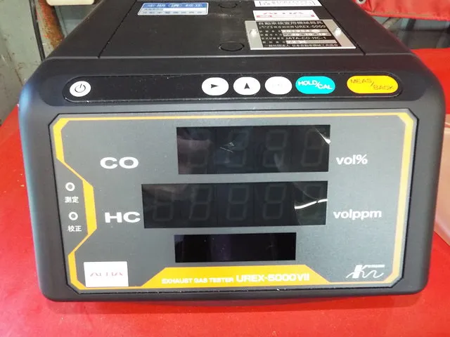 車検に欠かせない排ガス測定器、ALTIA製を使っております。ガソリン車の使用過程における規制対象成分である一酸化炭素(CO)と炭化水素(HC)を測定します。