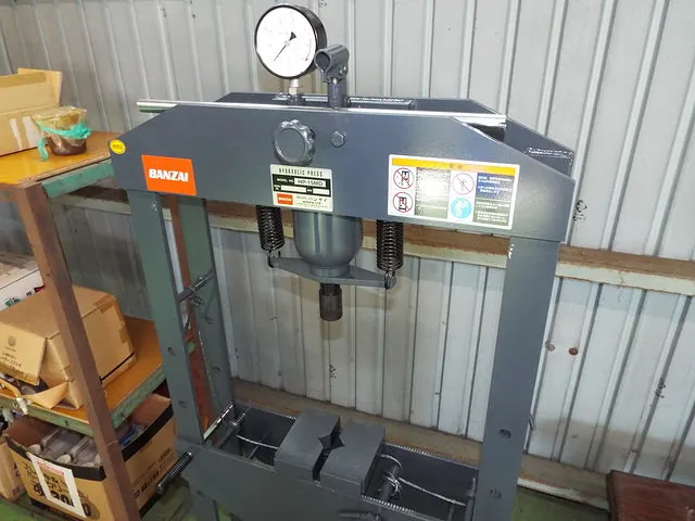 油圧プレスはベアリングの入替、シリンダーのスリーブ入替、クランクシャフトの曲がり修正、修正など圧入が必要時に使います。BANZAI製のプレスを使っております。