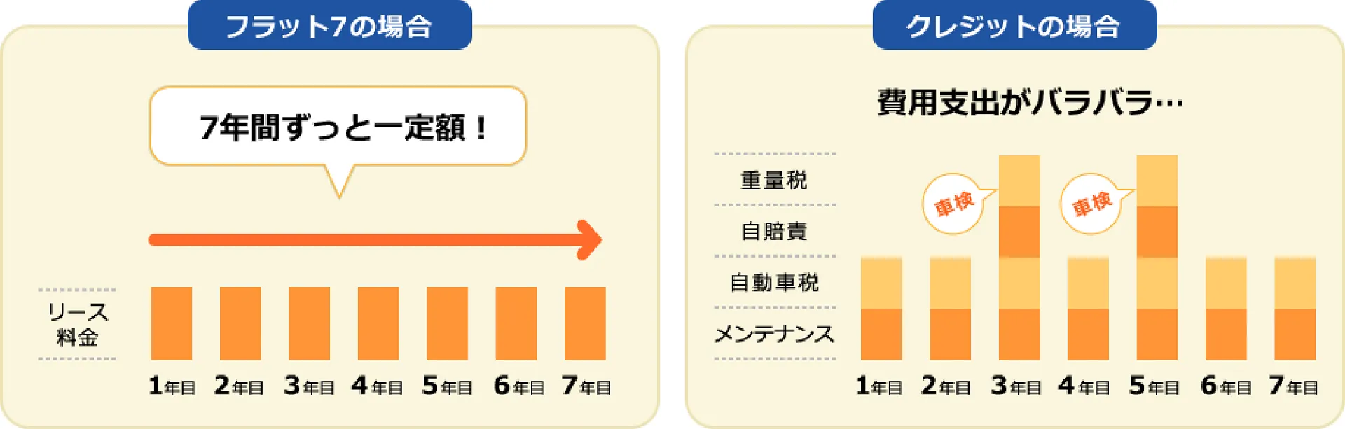 フラット7では、月額費用に車検代・税金などの維持費がほぼ全て含まれているため、月々一定額のお支払いで、突発的に大きな金額が必要になる事はほとんどありません。だから毎月の資金計画も立てやすくなります。